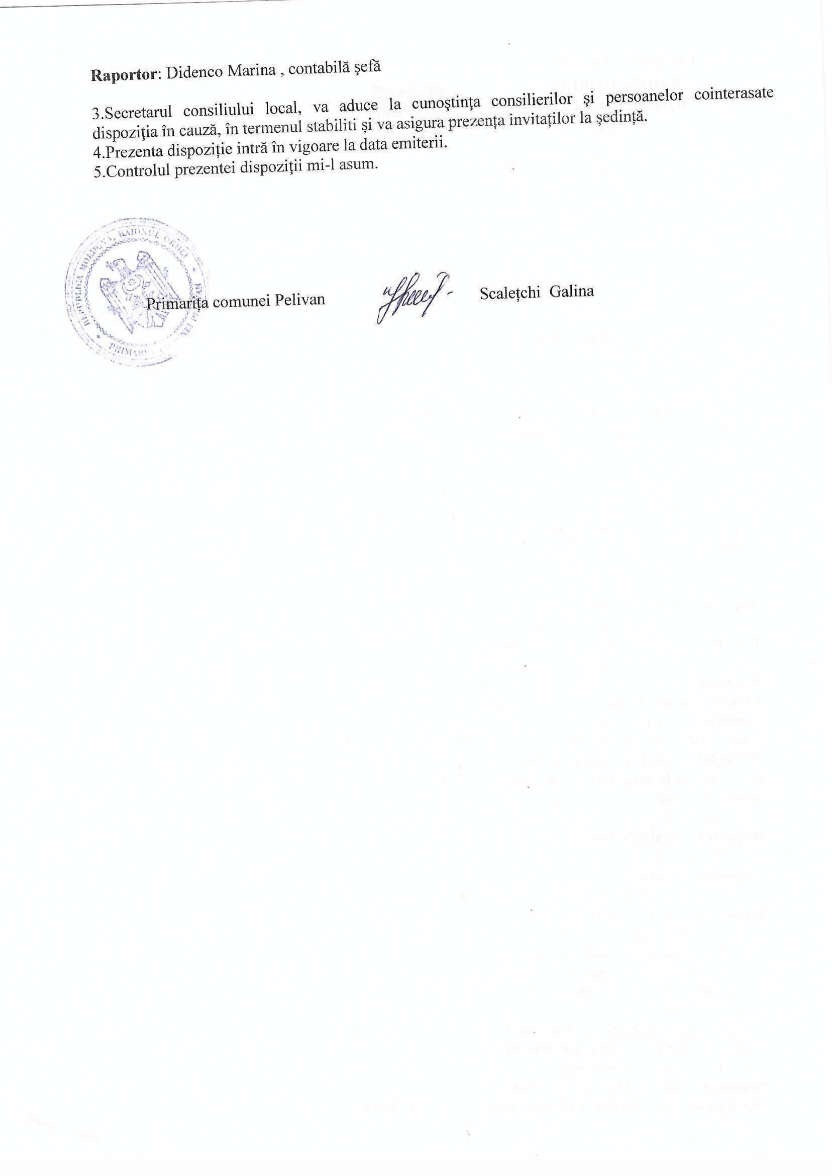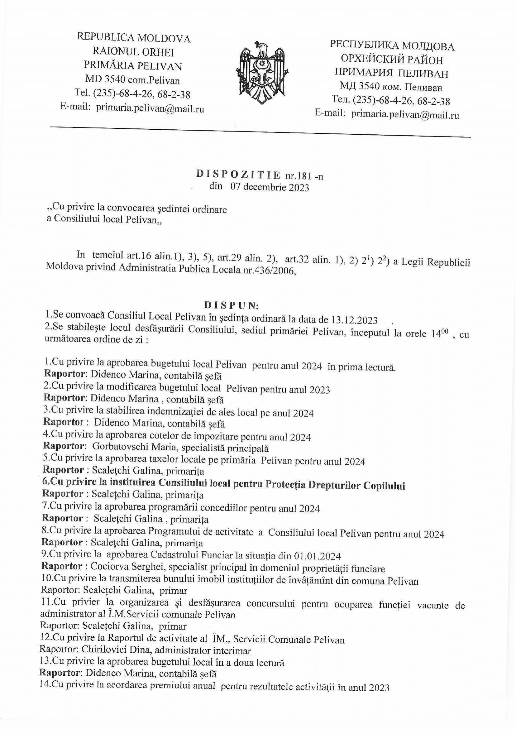 Dispoziție nr 181 Cu privire la convocarea ședinței ordinare a Consiliului local Pelivan