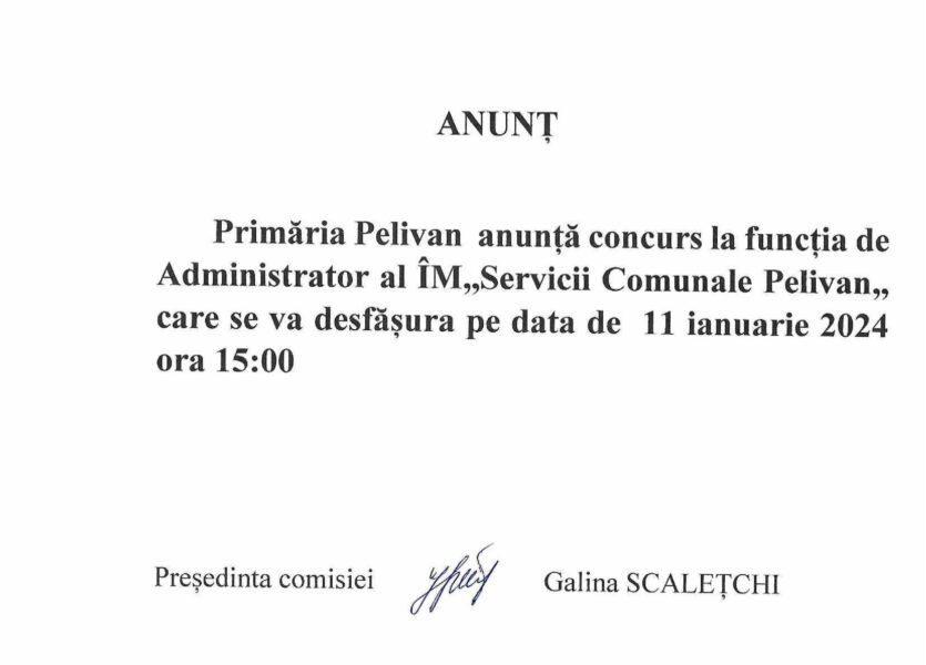 Anunț: Concurs pentru funcția de administrator al ÎM „Servicii Comunale Pelivan”