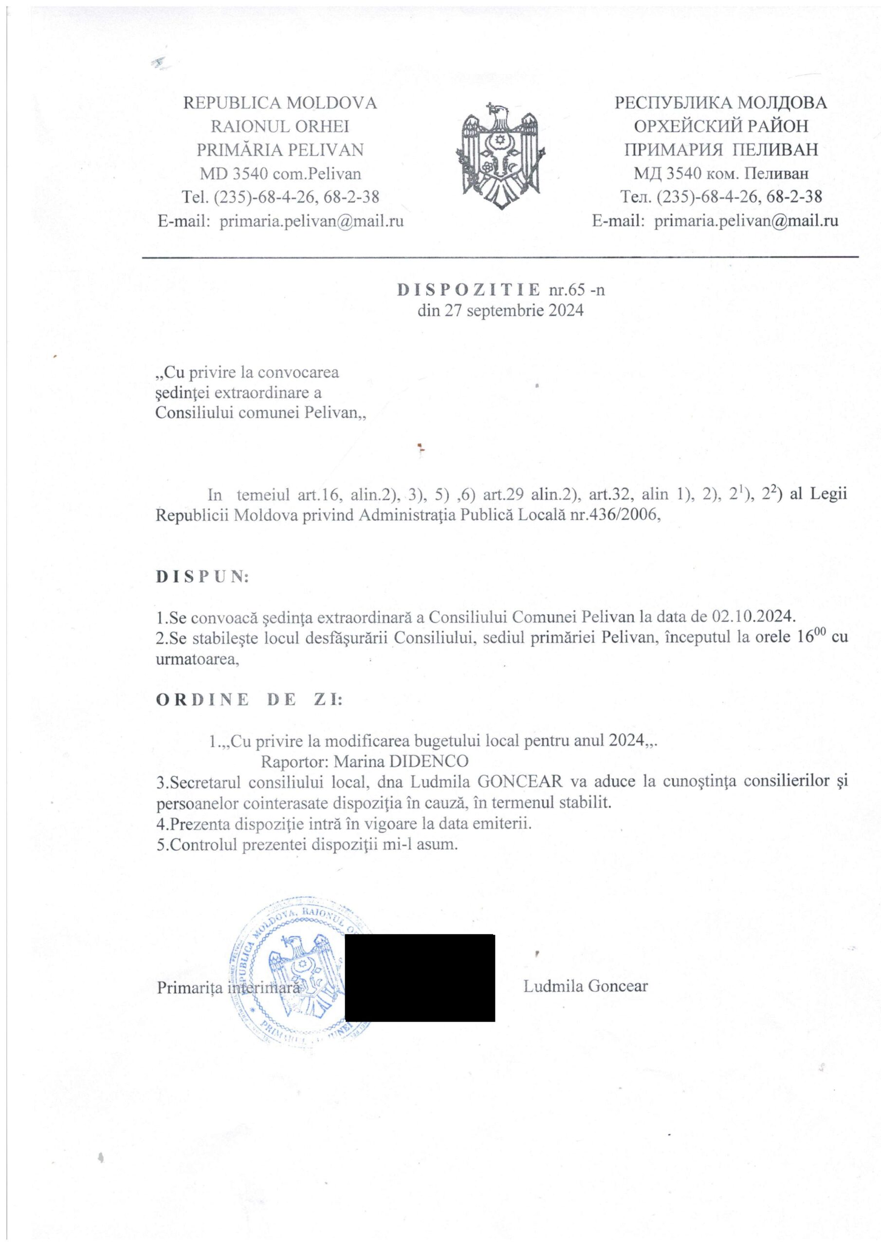 Convocarea ședinței extraordinare a Consiliului comunal Pelivan
