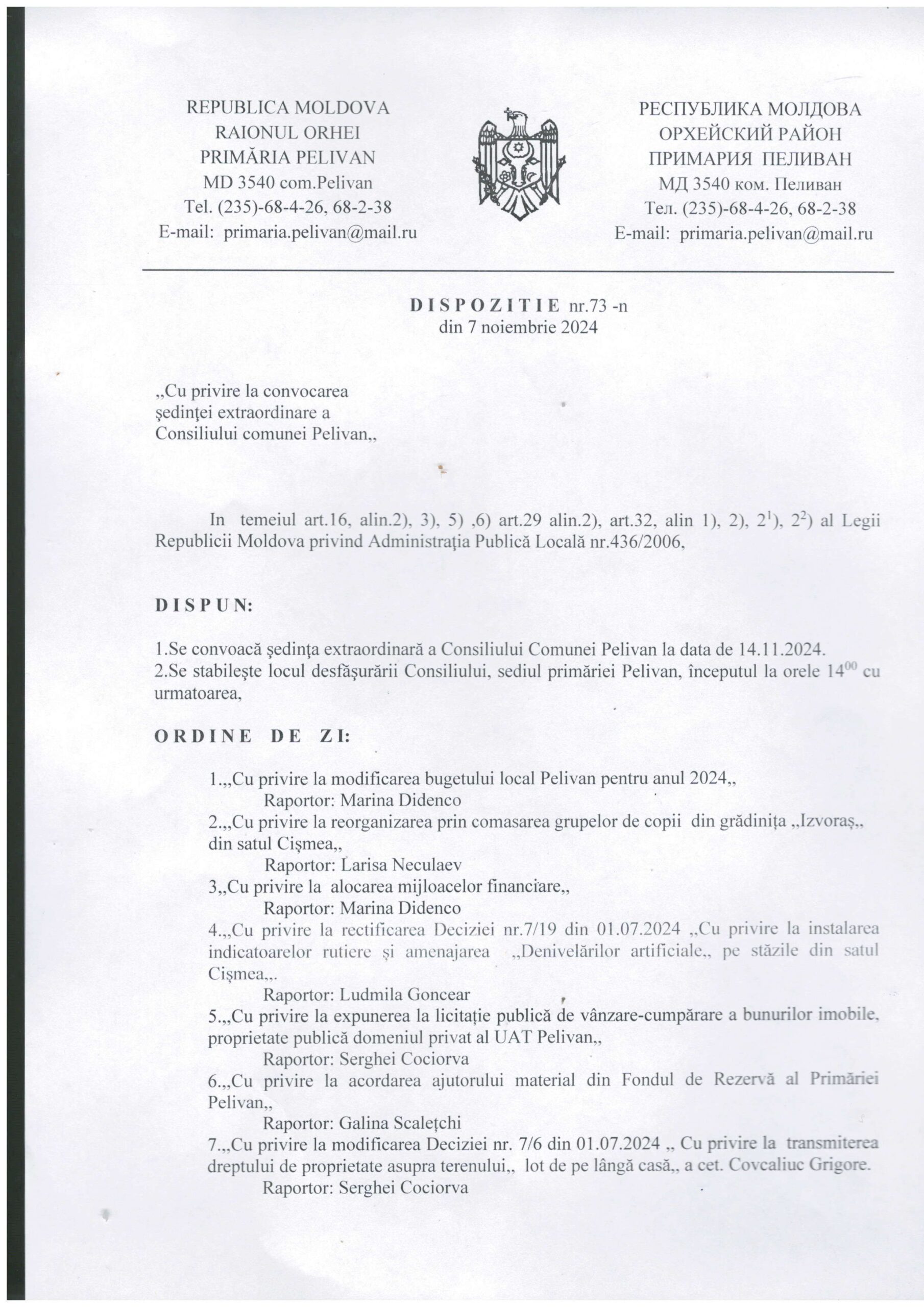 Anunț Cu privire la convocarea ședinței extraordinare a Consiliului comunei Pelivan