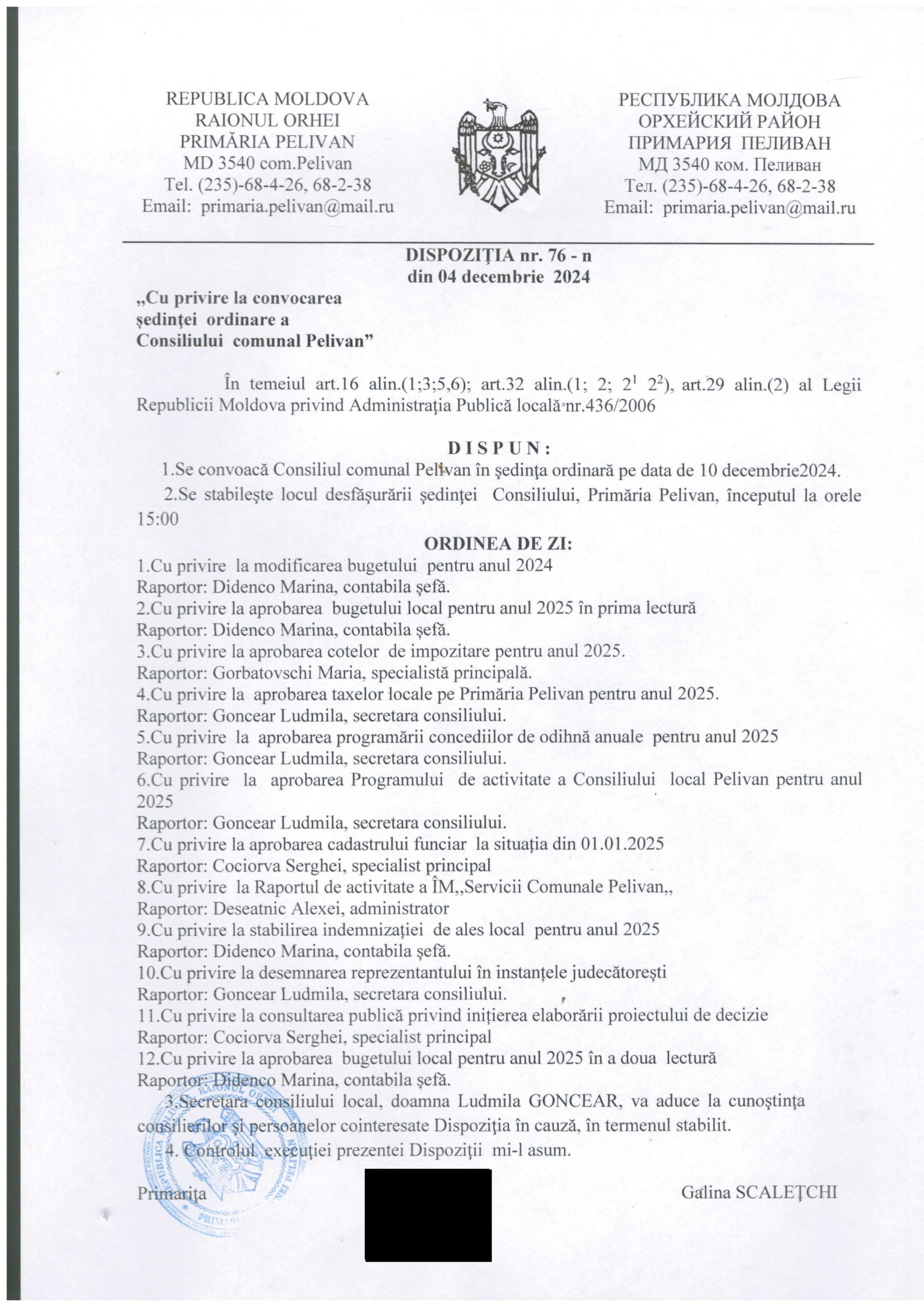 Anunț: Convocarea ședinței ordinare a Consiliului comunal Pelivan