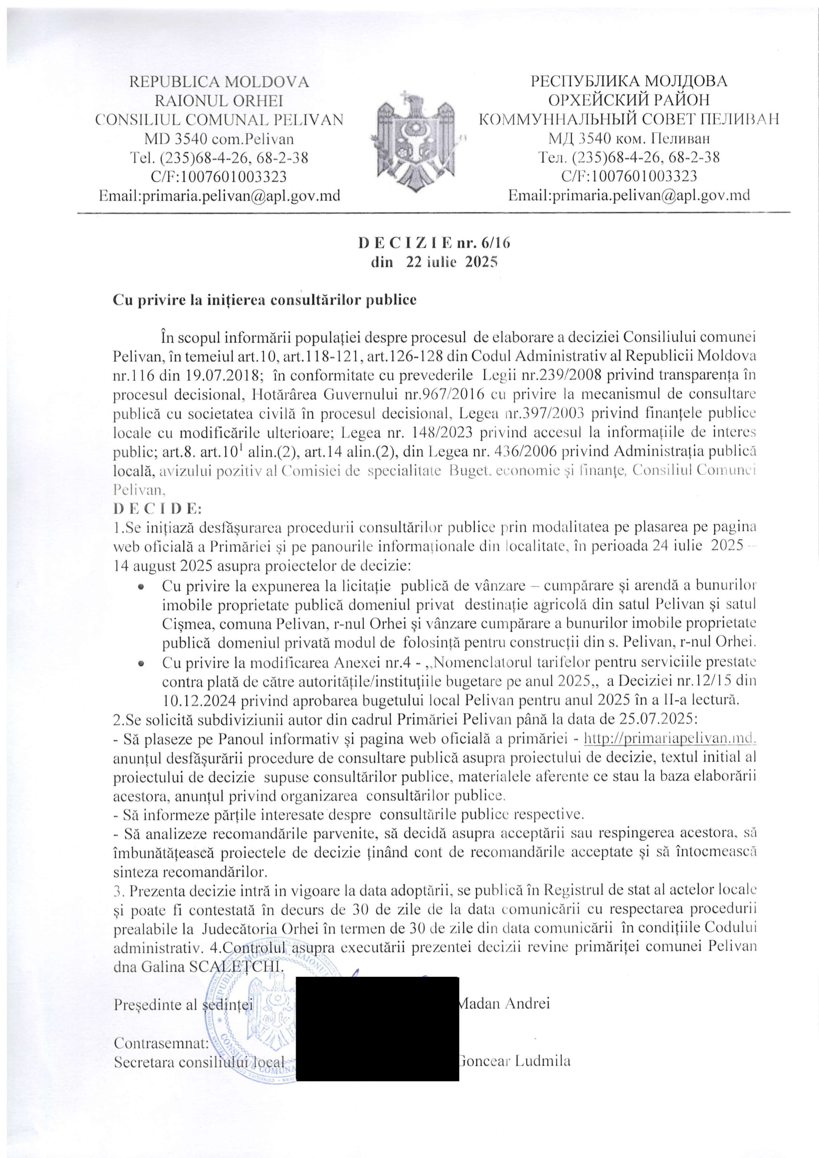 Autoritatea executivă а Consiliului comunal Pelivan, raionul Orhei inițiază începând cu data de 30 iunie 2025 […]